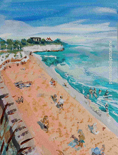 Broadstairs Beach on a Sunny Day - inspired from a glorious sunny day looking down the cliffs edge hungering to go swimming while the English sun lasted.. Painted on 300gsm paper in acrylic.